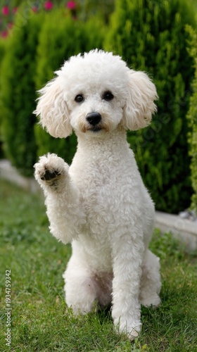Adorable white poodle waving paw in lush garden