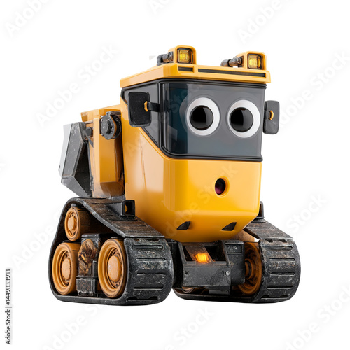 robot, animation, character, illustration, machinery, vehicle, technology, engineering, construction, industry, yellow, big eye, funny, playful, charming, adorable, digital artwork, isolated, white background, transportation, heavy equipment, toy, mascot