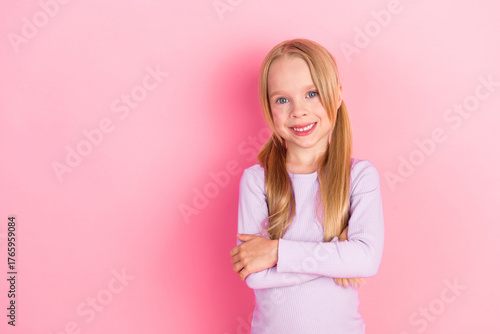 Adorable young girl in casual purple shirt smiling brightly while posing in front of a vibrant pink background