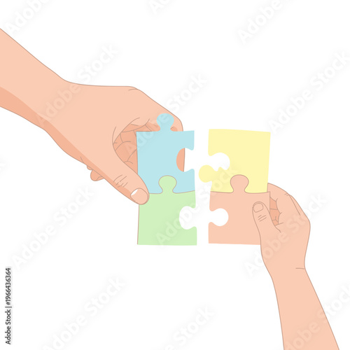 Adult and child hands connect colorful puzzle pieces, teamwork concept, isolated on white
