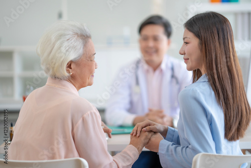 Adult Asian woman holds senior woman' s hand with kind and greetness while meets doctor at hospital, Older woman sees doctor with daughter.