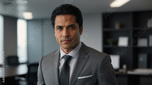adult black hair hispanic man in gray formal attire model portrait looking confident on an office background for ad concept space for text