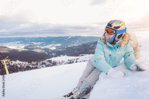 Adult caucasian woman skier rides a ski resort on a background of mountains and ski resort in down