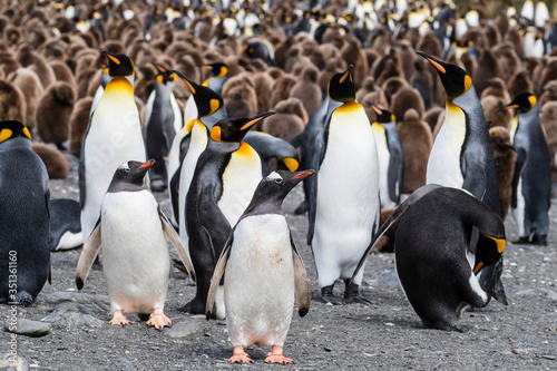 Adult gentoo penguins (Pygoscelis papua) on the beach with king penguins at Gold Harbor, South Georgia Island, Polar Regions