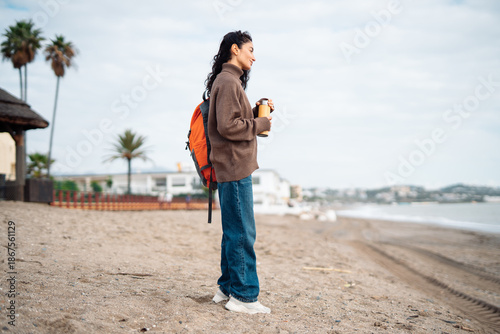 Adult woman standing on sandy beach holding reusable thermos with backpack enjoying calm seaside atmosphere during solo travel walk near ocean coastline