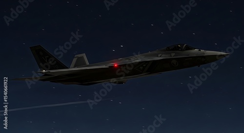Advanced 5th generation stealth fighter jet on a covert military mission, flying through a dark starry sky. Air Force combat aircraft conducting a secret night operation.