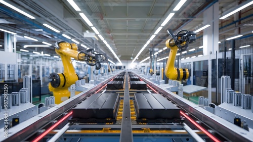 Advanced automated battery production line with robotic arms assembling lithium-ion cells on conveyor belt. Skilled workers in protective gear supervising high-tech manufacturing process.
