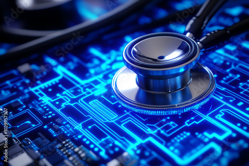 Advanced digital healthcare concept: stethoscope on a blue glowing circuit, symbolizing the merging of medical diagnostics with futuristic technology.