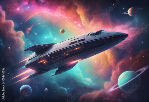Advanced spacecraft traveling through cosmic scene