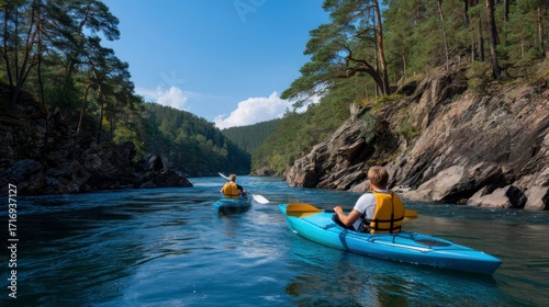 Adventure kayaking in serene nature river canyon action shot summer day wide angle outdoor exploration