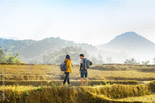 adventure travel from asian couple hiking and walk to the mountain in summer season