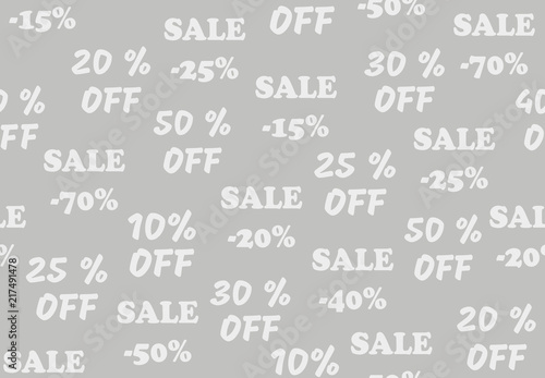 Advertising design. Seamless gray background with promotional offers, seasonal and holiday sale. Pattern for wrapping paper, bag, wallpaper, other promotional products. Different discount percentages.
