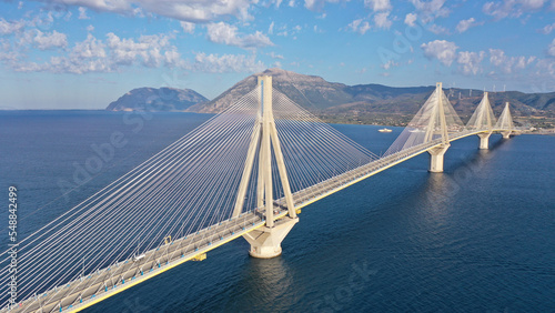 Aerial drone photo of famous state of the art modern cable strait bridge of Rio Antirio crossing corinthian gulf from Peloponnese seaside city of Rio to Antirio - mainland Greece