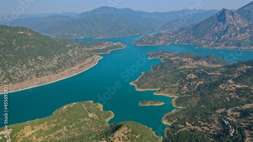 Aerial drone photo of huge fjord looking lake of Mornos a clear water supply for Attica region, Fokida prefecture, Greece