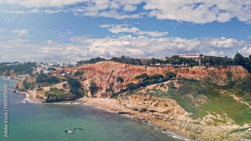 aerial, drone, shot, algarve, resort, historical, province, magical, cliff, exploring, cave, lagos, south, portugal, travel, adventure, coastline, atlantic, ocean, sandy, beach, clear, blue, water, idylli, nature, view, traveling, holiday, retreat, recreation, tree, greenery, forest, red, green, coastal, landscape, european, portuguese, hill, mountain, flying, fly, exploration, journey, europa, coast, sandstone, continent