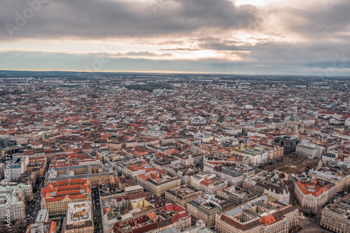 Aerial drone shot of Liberty Square in Budapest center in winter morning