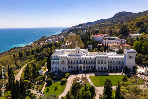 Aerial drone view of Livadia Palace with a beautiful landscaped garden in Crimea