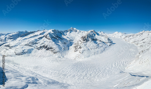 Aerial panorama of Great Aletsch Glacier in Alps winter season, covered with deep snow, Switzerland, which is a unesco heritage (stitched large file)