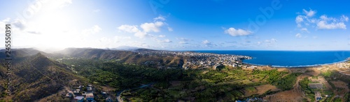 Aerial Panoramic view of Sugar canne and coconut plantation near Calheta Sao Miguel in Santiago island in Cape Verde - Cabo Verde