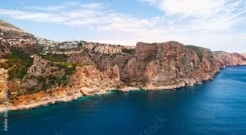 Aerial photo drone point of view picturesque Cala del Moraig in Benitachell coastal town. Bright turquoise waters bay of Mediterranean Sea white sandy beach, huge cliffs coastline. Costa Blanca. Spain
