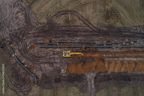 aerial photograph of the laying pipe of large diameter in clay soil. Autumn
