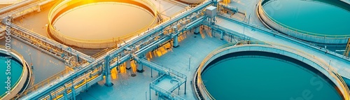 Aerial shot of a wastewater treatment facility, circular tanks, golden sunset glow, clean water management