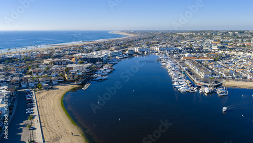 Aerial shot of boats and yachts in the Newport Bay in Newport Beach California USA