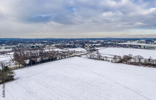 Aerial shot of Holderberg village in Moers during winter, Germany