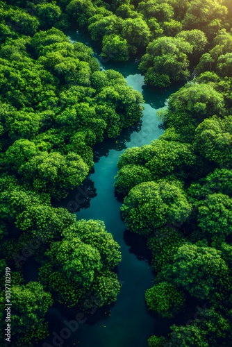aerial view, green, mangrove, estuary, forest, river, curve, nature, ecosystem, water, environment, tree, biodiversity, wetland, sunlight, rainforest, wetland, swamp, tropical rainforest, conservation, lush, sunset, vegetation, tropical, abundant, horizontal, journey, photo, travel destination, coastal, tropical climate, awe, background, earth, idylli, no people, calmness, wildlife, color image, foliage, habitat, canopy, exoticism, up high, ai