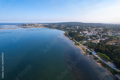 Aerial view above the Foz do Arelho lagoon and beaches in Portugal