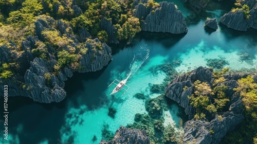 Aerial View of a Boat Navigating Through a Lagoon in the Philippines