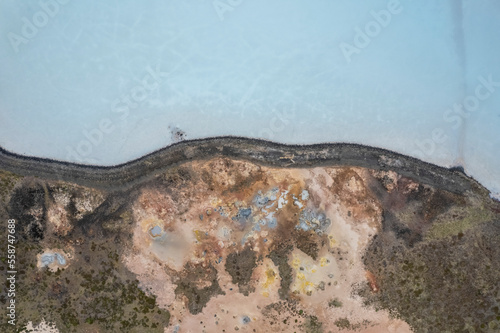 Aerial view of a coastline along the lakefront at Gunnuhver Hot Springs (Geo Thermal Hot Spring), Grindavík, Iceland.