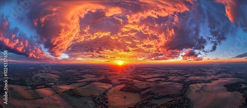 Aerial view of a fiery sunset over a vast field with a panoramic view of the cloudscape.