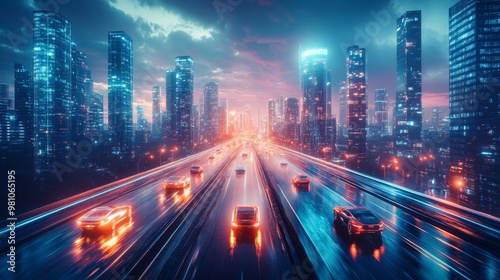 Aerial view of a futuristic highway filled with sleek flying cars, weaving between towering skyscrapers, the city below glowing with neon lights and holograms