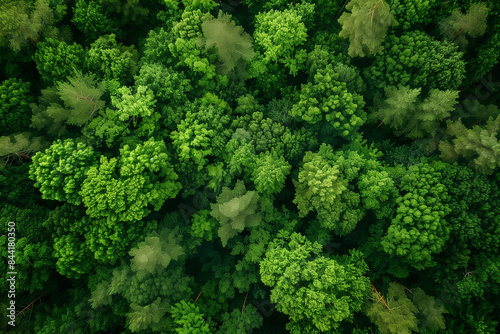 Aerial view of a landscape of a lush forest taken by a drone, displaying dense green foliage and towering trees, perfect for a nature-themed wallpaper