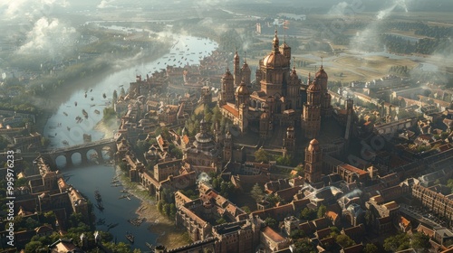 historic, architecture, aerial, view, grand, city, river, dawn, sunrise, ancient, building, scenic, landscape, vibrant, colours, city landscape, bridge, waterway, lush, greenery, majestic, dome, urban, exploration, architectural, beauty, panoramic, serene, atmosphere, foggy, morning, mediaeval, structure, rooftop, cultural, heritage, stunning, vista, generative, ai