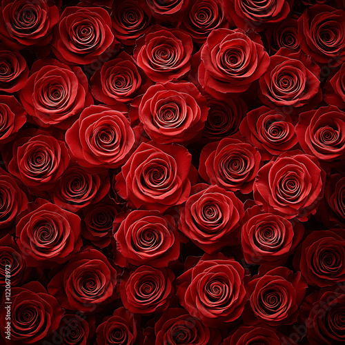 Aerial view of a natural pattern of fresh roses, forming a vibrant floral wall with rich tones and detailed textures