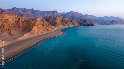 desert, coast, ocean, beach, mountain, landscape, aerial view, remote, arid, rocky, turquoise water, sand, shoreline, geology, geography, nature, travel, adventure, view, horizon, dune, cliff, hill, rock formation, panorama, seascape, wilderness, scenic, vista, outdoors, earth, planet, eco, environment, habitat, summer, day, bright, sunlit, clear, blue, brown, tan, gold, heat, dry, calm, serene, peaceful