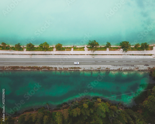 Aerial view of a road along the Durrensee, Lago di Landro, Dolomites, Italy.