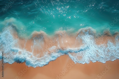 aerial view of a sandy beach turquoise waves gently lapping the shore sunlight sparkles on the water evoking a sense of relaxation and summer vibes perfect for vacation dreaming