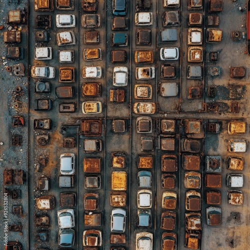 Aerial view of a sprawling scrap yard filled with rows of old cars at Fremantle Port, Perth, the landscape dotted with rusty metal