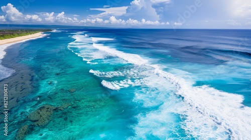 Aerial view of a stunning tropical beach with turquoise water, waves crashing on the shore, and a clear blue sky.