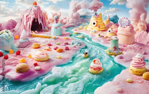 food, landscape, island, aerial, view, whimsical, float, constructed, pastry, candy, epicure, paint, imaginative, enchant, fantasyland, surreal, escapism, feast, concept, treat, confection, playful, texture, atmosphere, creative, design, dreamscape, indulgent, sugar, art, epicure, dessert, visual, scenery, colours, dreamy, artistic, vibrant, decorative, nature, exploration, fantasy, culinary, sweet, magical, river, paradise