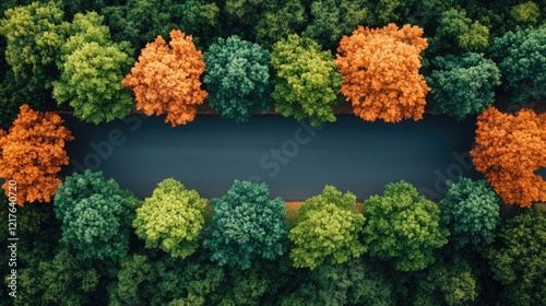Aerial view of a winding road surrounded by trees in vibrant autumn colors with ample copy space for text