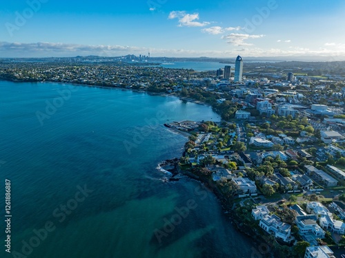 Aerial view of Auckland, New Zealand, showcasing coastal residential areas and the city skyline. Coastal homes and city buildings are visible. TAKAPUNA, AUCKLAND, NZ