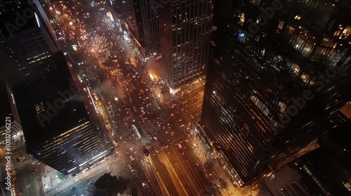 aerial, tied-up, city, downtown, evening, glow, light, road, traffic, skyscraper, urban, light, architecture, night, view, bustling, movement, skyline, vibrant, street, warmth, car, people, lifestyle, modern, environment, city landscape, intersection, driver, transportation, scene, pattern, activity, noise, business, metropolis, overhead, top, perspective, dynamic, rush, atmosphere, urbanity, bright, illuminated, network