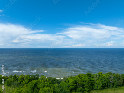 Aerial view of calm and wild Saka beach with a clear blue water on a sunny summer day. Beautiful green field with trees and bushes near the sea. Saka, Ida Viru county, Estonia.