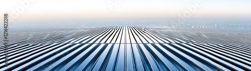 Aerial view of city skyline, futuristic lines converging, distant buildings, urban landscape, design concept