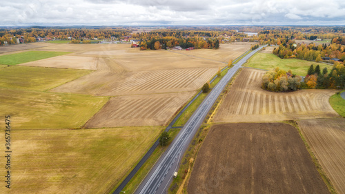 Aerial view of country road, autumn trees and ploughed fields. Aerial panorama of beautiful farmlands