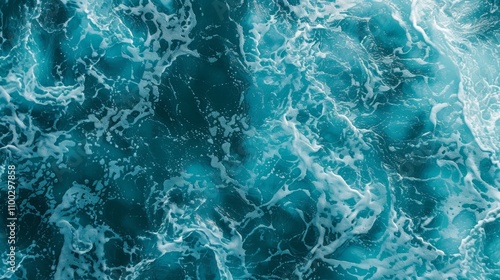 Aerial view of deep blue sea with turbulent waves creating white foam patterns, rich texture shows energy and movement.